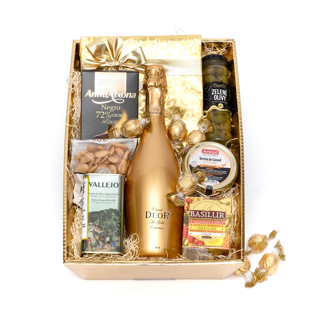 Darčekový kôš Zlatý poklad spája luxus, gurmánske produkty a prestížny dizajn, čím vytvára ideálny darček na každú výnimočnú príležitosť.